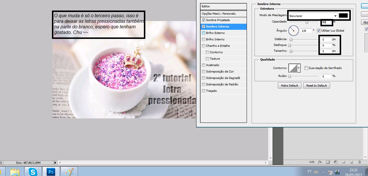 Clique algumas vezes sobre a cama da letra e aperte em Sombra Projetada Clarear, cor branco e o resto vejam na imagem